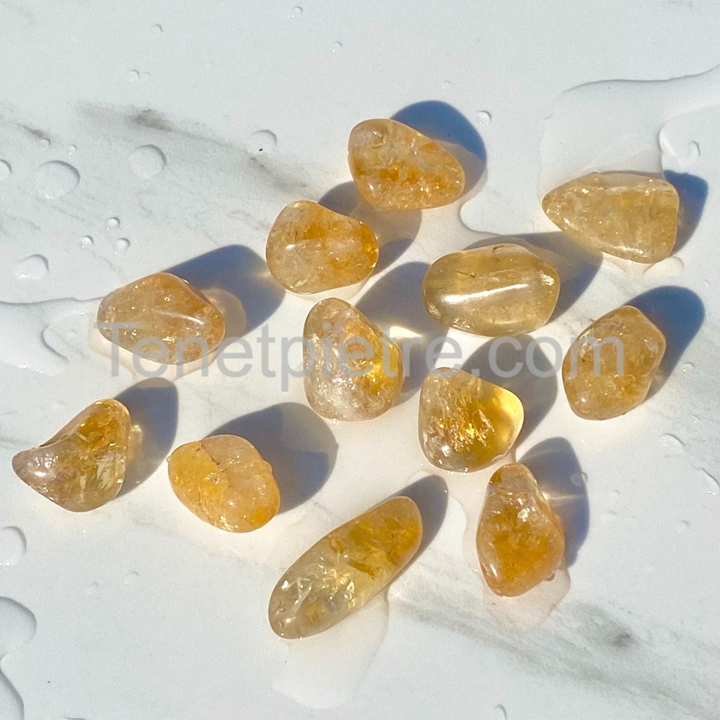 Citrine Quartz "Madera" (heated amethyst) tumbled in multiple sizes. This stone is the result of the coloring of amethyst subjected to temperatures above 220 degrees celsius. At a crystal therapy level it can maintain the properties of amethyst, although they will act differently due to the change in color.