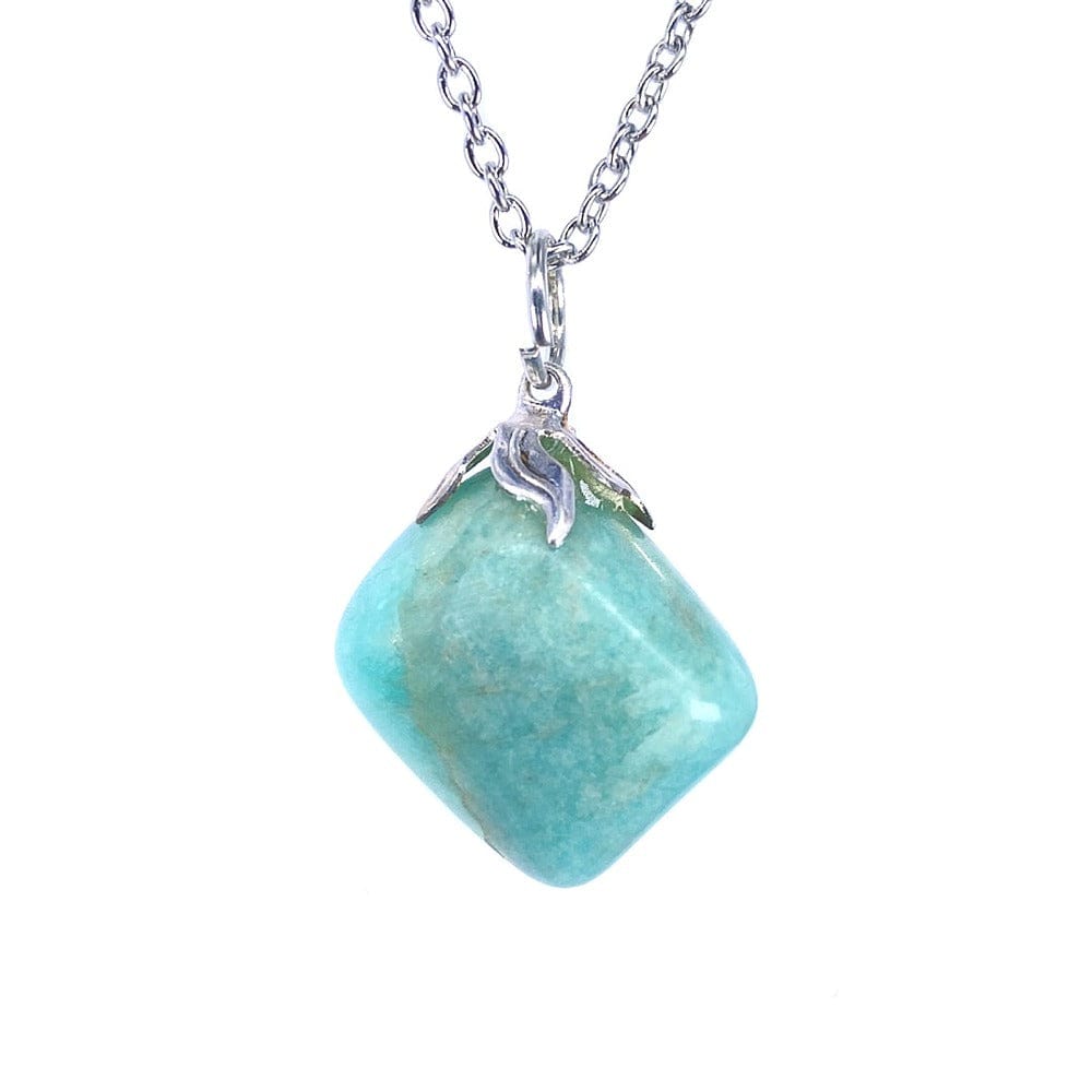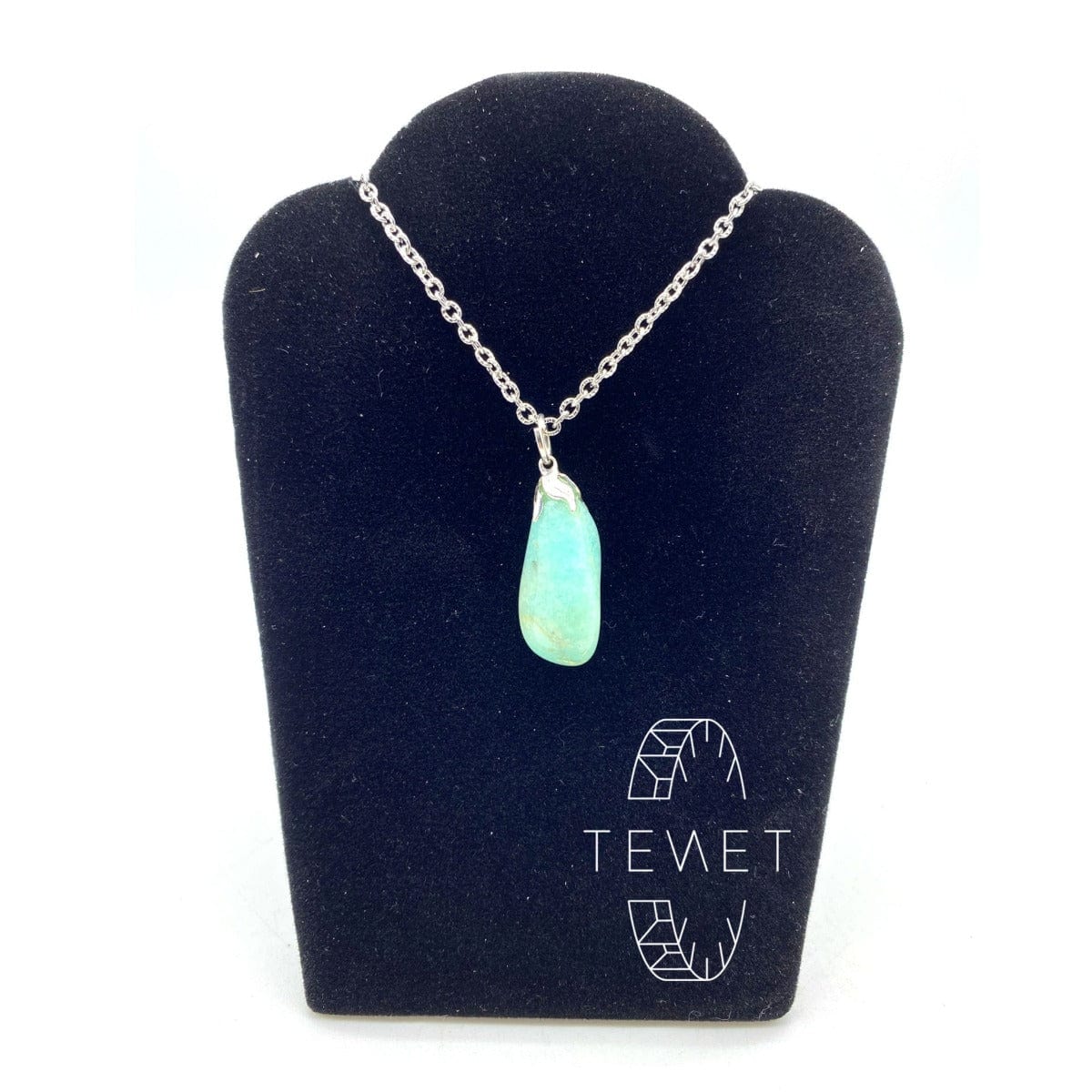 Ciondolo in Amazzonite liscia naturale, disponibile con catenina in acciaio inox o filo in caucciù nero. Per le proprietà dell'Amazzonite clicca qui.