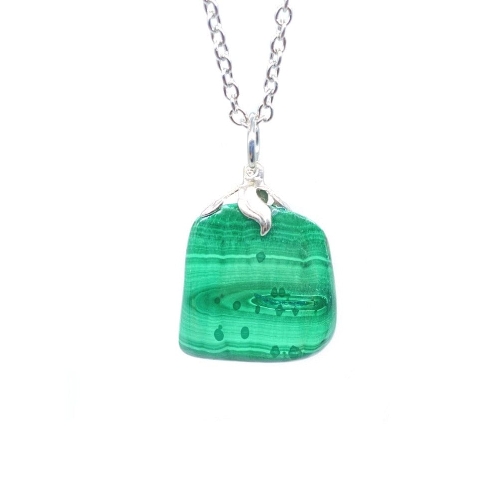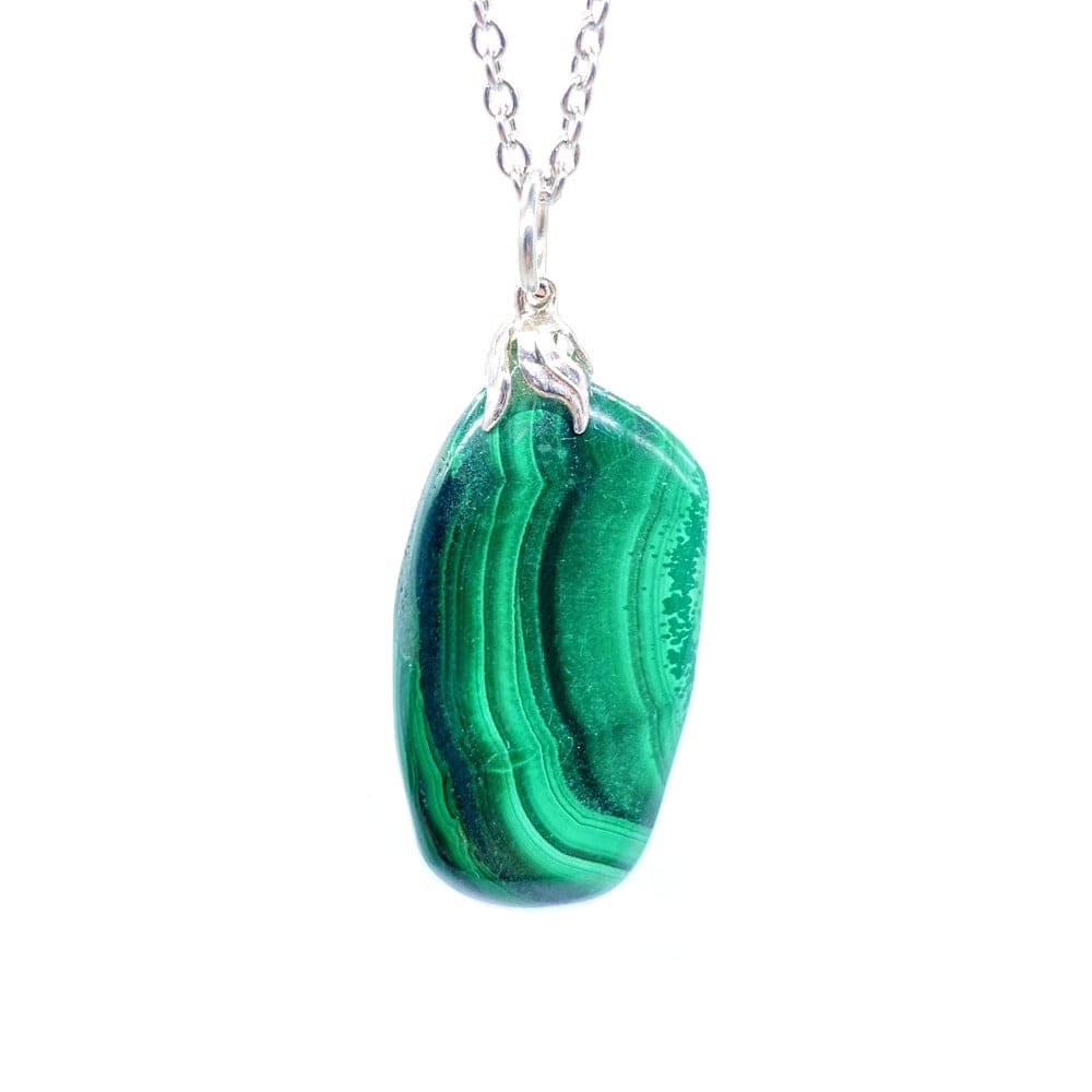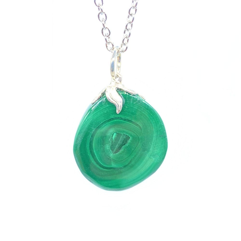 Ciondolo in Malachite liscia naturale, disponibile con collanina in acciaio inox o filo in caucciù nero. Per le proprietà della Malachite clicca qui.