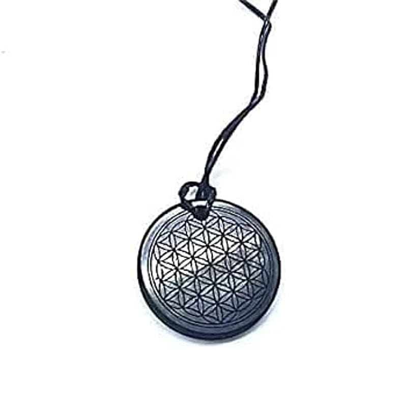 Collana con ciondolo lavorato con incisione a forma di "fiore della vita" e cordoncino in fibra naturale. Assorbe e scherma le energie elettromagnetiche.